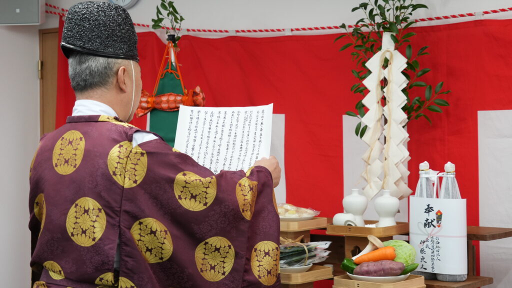 また、開所式に先立ち奉告祭を執り行い、熊野新宮神社の宮司様より祝詞を奏上していただきました。