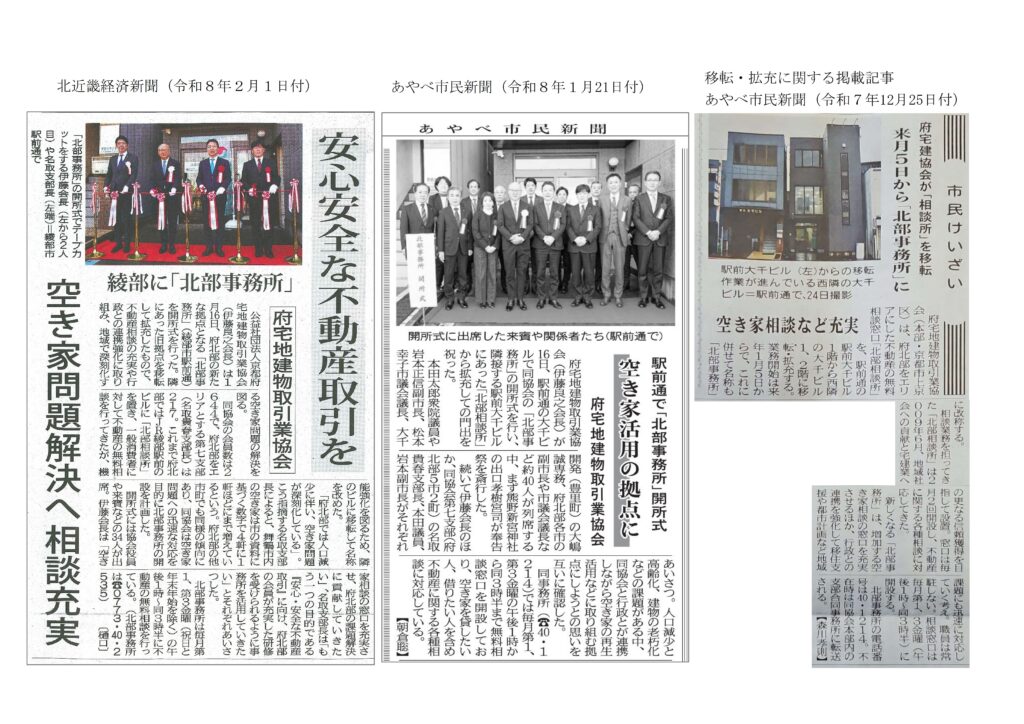 京都宅建は従来からJR綾部駅前に北部相談所を設置し、京都府の北部地域における不動産無料相談をお受けしてまいりましたが、この度、協会事業の北部地域における活動拠点として機能強化を図り、1月5日(月)より隣接するビルへ移転し、「北部事務所」へ名称を改め、1月16日(金)に開所式を開催いたしました。
